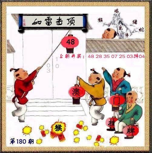 180期挂牌《如雷击顶》 解释:好像雷电击中脑门。比喻受到极大震动或遭到沉重打击。曹鸿骞《命运》。 解料:雷肖蛇马羊,大肖牛虎马羊狗猪。挂:48龙,龙冲狗。爆:猴,猴冲虎。 七肖:蛇马羊牛狗猪龙 五肖:蛇马羊牛狗 四肖:蛇马羊牛 三肖:蛇马羊 二肖:蛇马 一肖:蛇 |