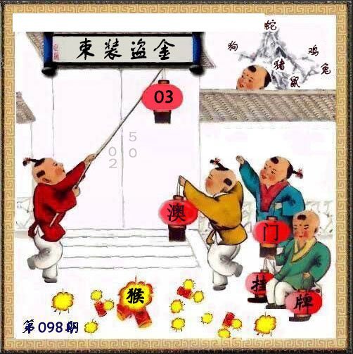 098期挂牌《束装盗金》 解释:意思是无端见疑。出自《汉书·直不疑传》。 解料:凶丑肖鼠牛虎猴狗猪,金肖猴鸡,多疑解君王龙虎。挂:03牛,牛冲羊。爆:猴,猴冲虎。 七肖:猴虎牛狗猪鸡龙 五肖:猴虎牛狗猪 四肖:猴虎牛狗 三肖:猴虎牛 二肖:猴虎 一肖:猴